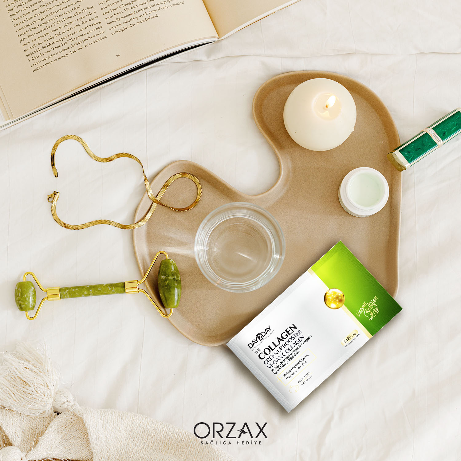 Day2Day The Collagen Green Up Booster, her saşede 1,425 mg CollaGEM patentli vegan kolajen peptitleri, mineral ve vitaminler içeren bir gıda takviyesidir. İçeriğindeki B12 vitamini aktif formdadır ve D vitamini patentli vegan D vitaminidir. Yeşil elma aromalı saşe formu sayesinde suya karıştırılarak pratik ve keyifli bir içim deneyimi sunar.