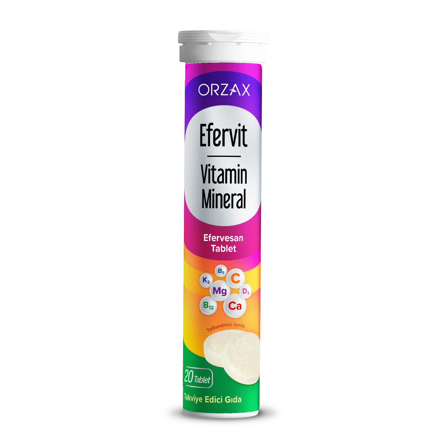 Efervit Vitamin Mineral, 12 vitamin ve 5 mineral içeren bir gıda takviyesidir. Aktif fomda Vitamin B12 (MecobalActive) içerir. +MecobalActive®, HealthTech Bio Actives SLU firmasına ait patentli bir aktif B12 vitamini kaynağıdır. Lezzetli tadı ve güzel kokusu ile kolay tüketim avantajına sahiptir. Çözünürlüğü hızlıdır ve tortu bırakmaz. Laktoz, Glüten, Koruyucu içermez.