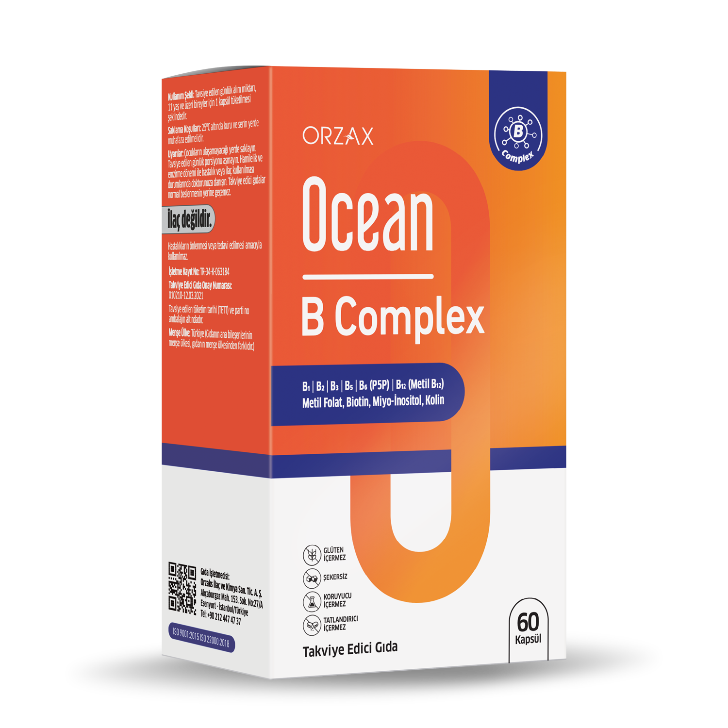 Ocean B Complex içeriğindeki 8 farklı B grubu vitaminine ek olarak Kolin ve İnositol içeren bir gıda takviyesidir. Aktif formda vitamin B12, Folat ve P5P içerir. Ocean B Complex özel Vcaps bitkisel kapsüller kullanılarak üretilmiştir. Titanyum dioksit içermez. Glüten, Renklendirici, Koruyucu, Şeker İçermez.