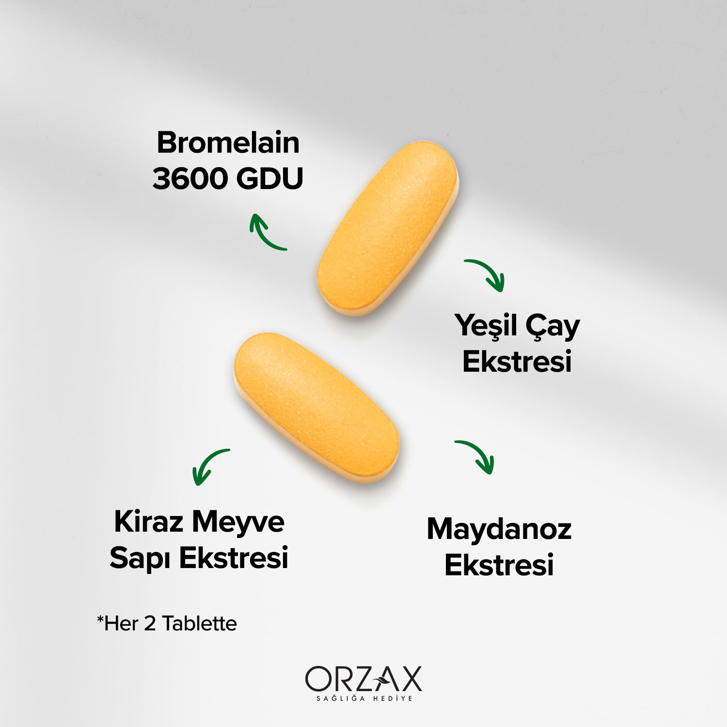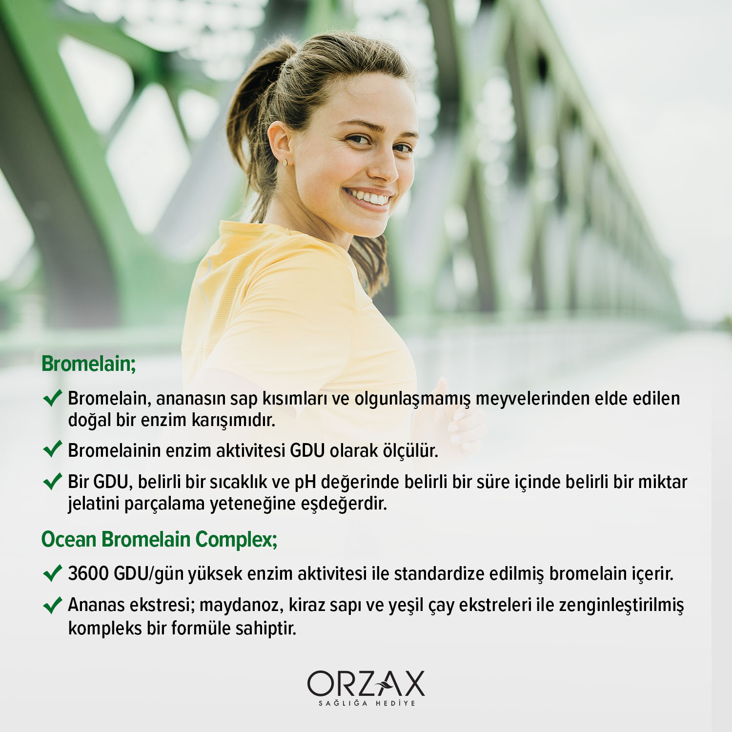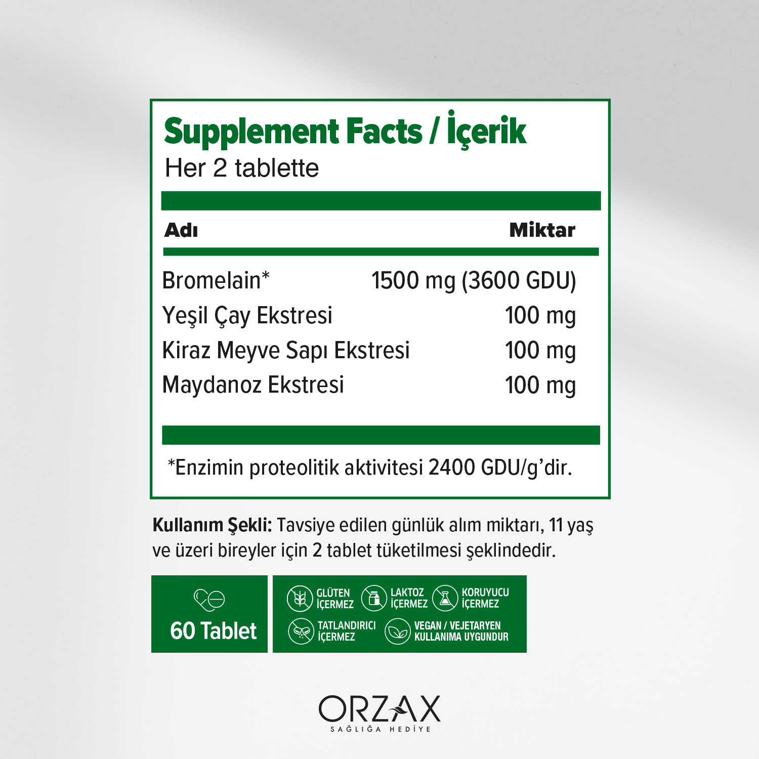 Ocean Bromelain Complex, her 2 tablette 1500 mg bromelain,yeşil çay ekstresi, kiraz meyve sapı ve maydanoz ekstresi içeren takviye edici gıda takviyesidir. Bromelain enzim aktivitesi genellikle “Gelatin Digesting Units” (GDU) olarak ifade edilir. Bromelain Complex her 2 tablette 3600 GDU/g etkinliğe sahiptir. Koruyucu, tatlandırıcı, laktoz, glüten içermez.