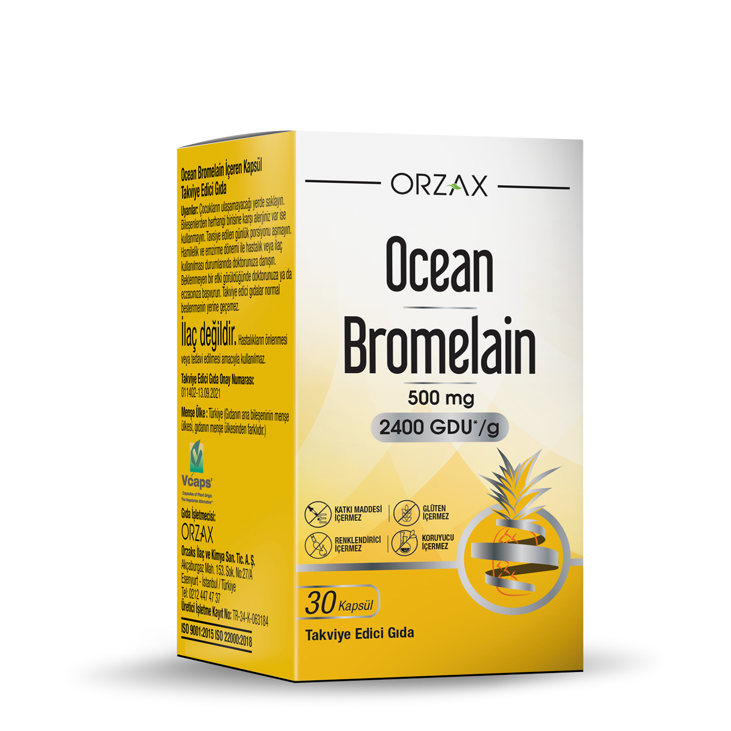 Bromelain, genellikle ananas ağacından elde edilen enzimler karışımıdır. Ocean Bromelain, 2 kapsülünde 1000 mg bromelain içerir ve 2400 GDU/g etkinliğe sahiptir. Vcaps bitkisel kapsül teknolojisi ile üretilmiştir. Koruyucu, renklendirici, glüten içermez.