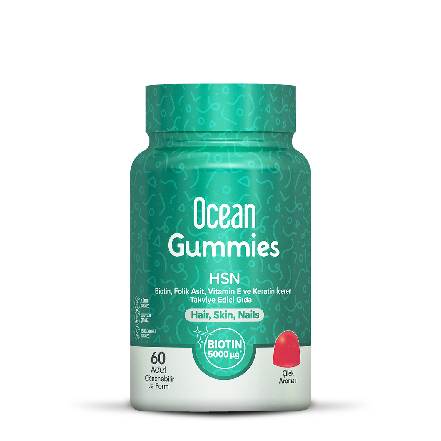 Ocean Gummies HSN; biotin, folik asit başta olmak üzere 9 vitamin, 3 mineral ve hidrolize keratin içeren çiğnenebilir jel formda bir gıda takviyesidir. Çilek aroması ile lezzetli bir deneyim sunar. Ocean Gummies HSN glikoz şurubu, jelatin, yapay tatlandırıcı ve koruyucu, yapay renklendirici içermez. Ocean Gummies HSN, Türkiye’nin çiğnenebilir jel formda takviye edici gıdaların Ar-Ge ve üretimini gerçekleştirmek üzere kurulan ilk tesisinde geliştirilmiş ve üretilmiştir.