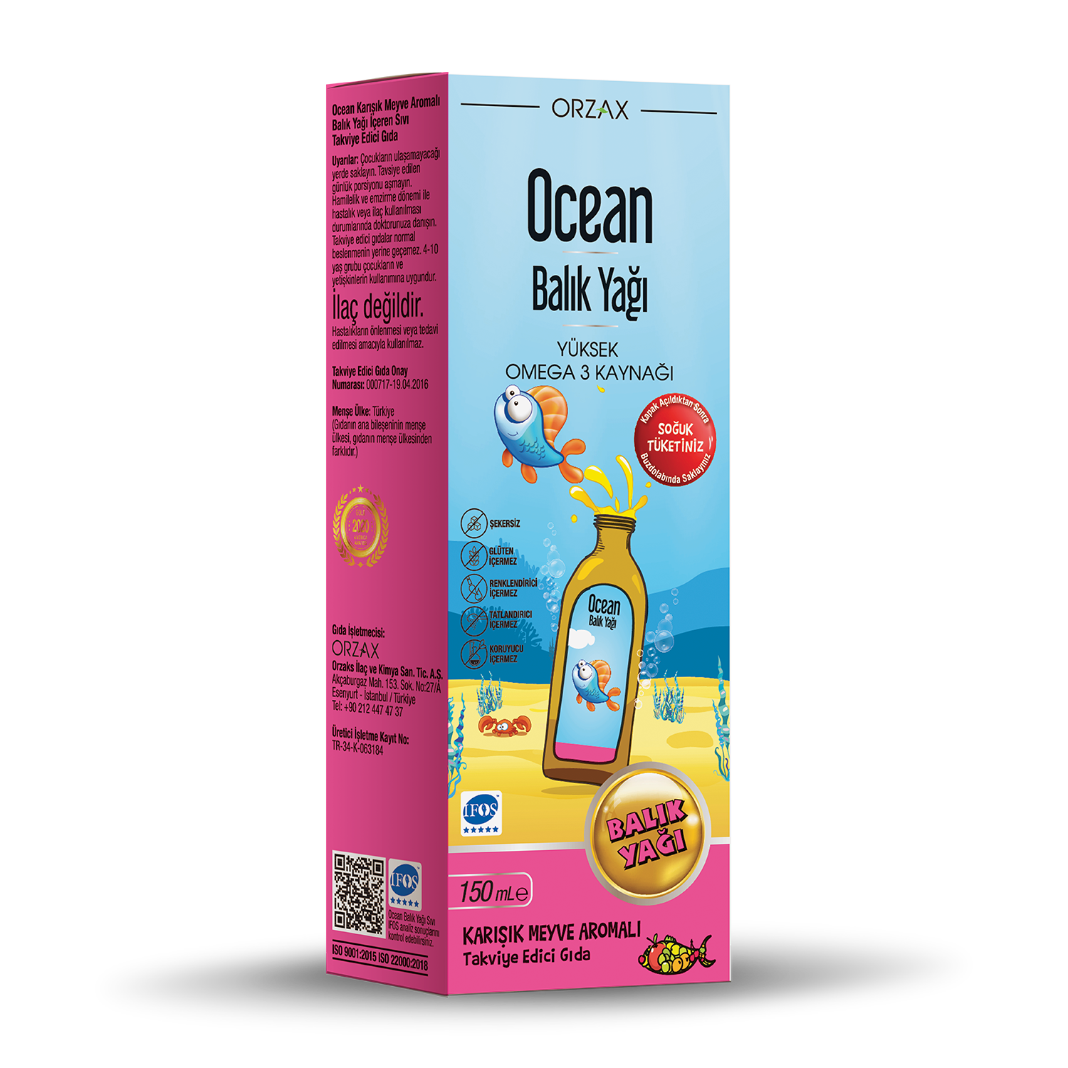 Ocean Balık Yağı içeriğindeki omega-3; ağır metallerden uzak, temiz ve soğuk sularda yaşayan, küçük cins balıkların gövde yağlarından elde edilmiştir. IFOS 5 yıldız kalite onayına sahiptir. Singapur Taste Awards ve America Taste Awards’te altın madalyaya layık görülmüştür.