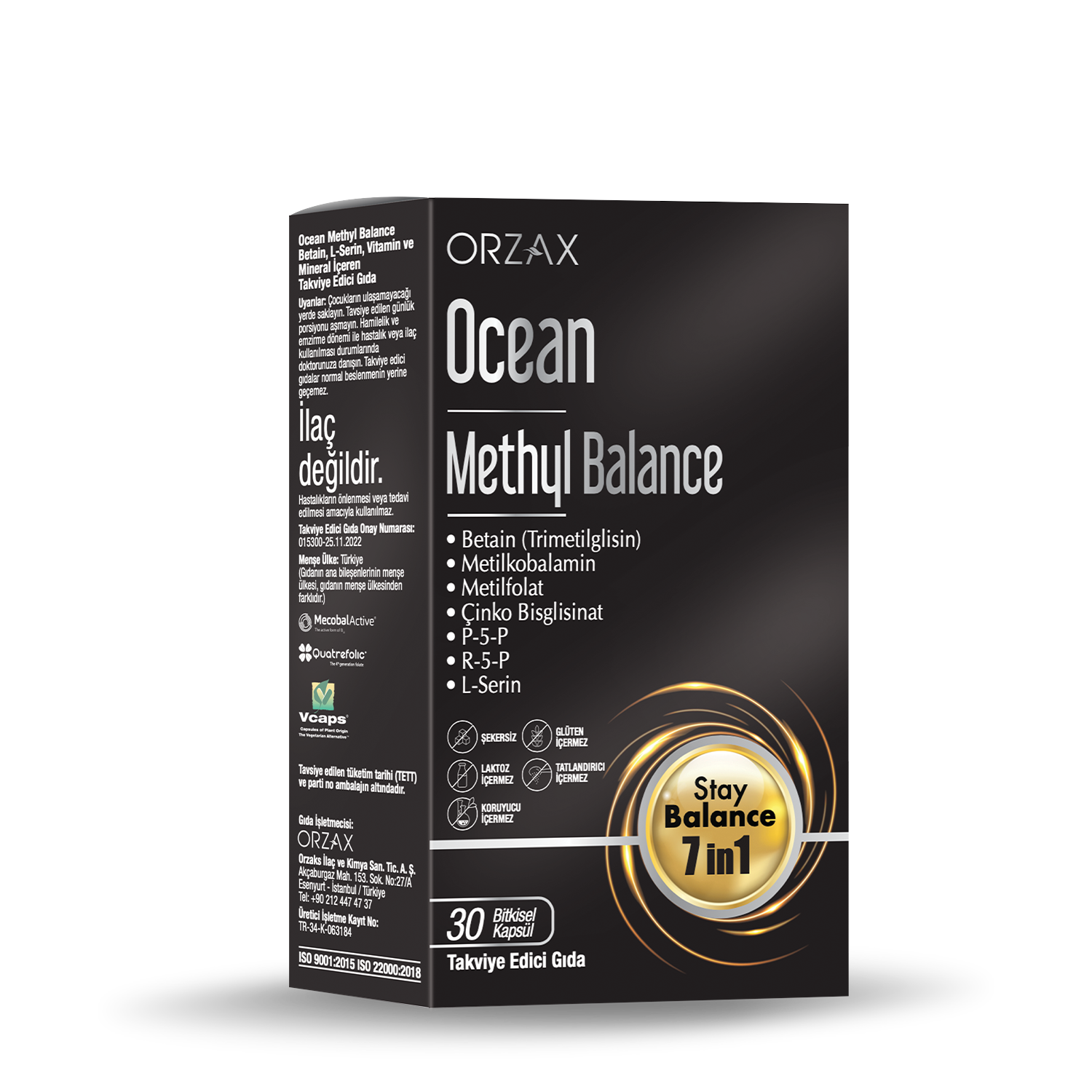 Ocean Methyl Balance, her kapsülde aktif formda B12 (Metilkobalamin), B6(P-5P), B2(R-5-R) ve Betain, L-serin, Çinko Bisglisinat içeren gıda takviyesidir. Koruyucu, tatlandırıcı, şeker, laktoz ve glüten içermez.