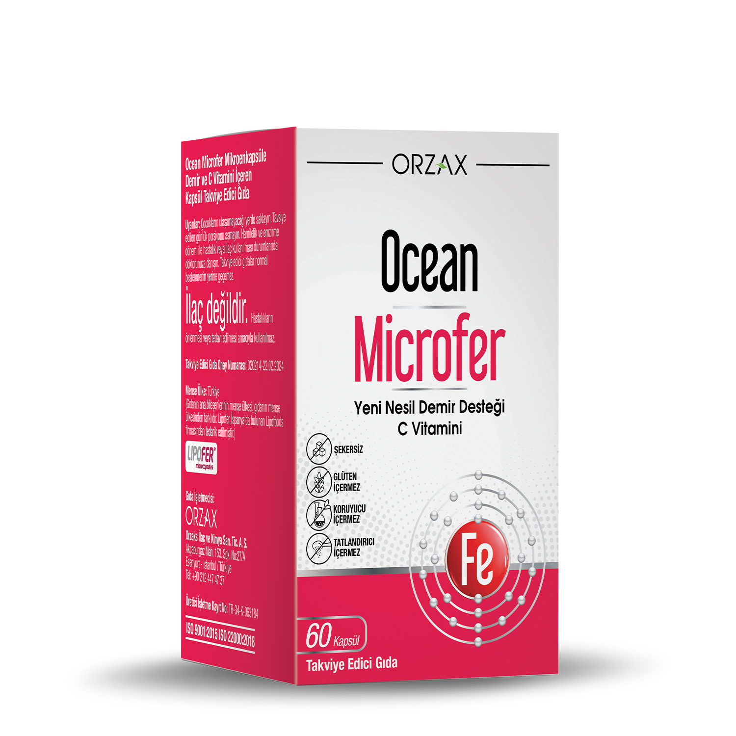 Ocean Microfer Kapsül, mikroenkapsülasyon teknolojisi ile üretilmiş 17 mg demir ve 80 mg C Vitamini içeren bir gıda takviyesidir. Glüten, şeker, tatlandırıcı ve koruyucu içermez.