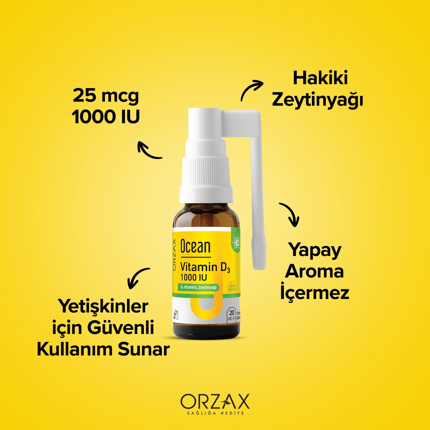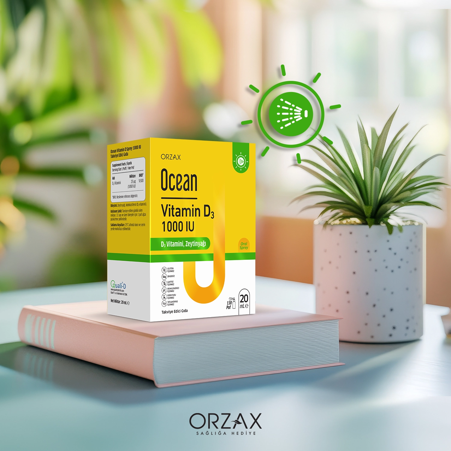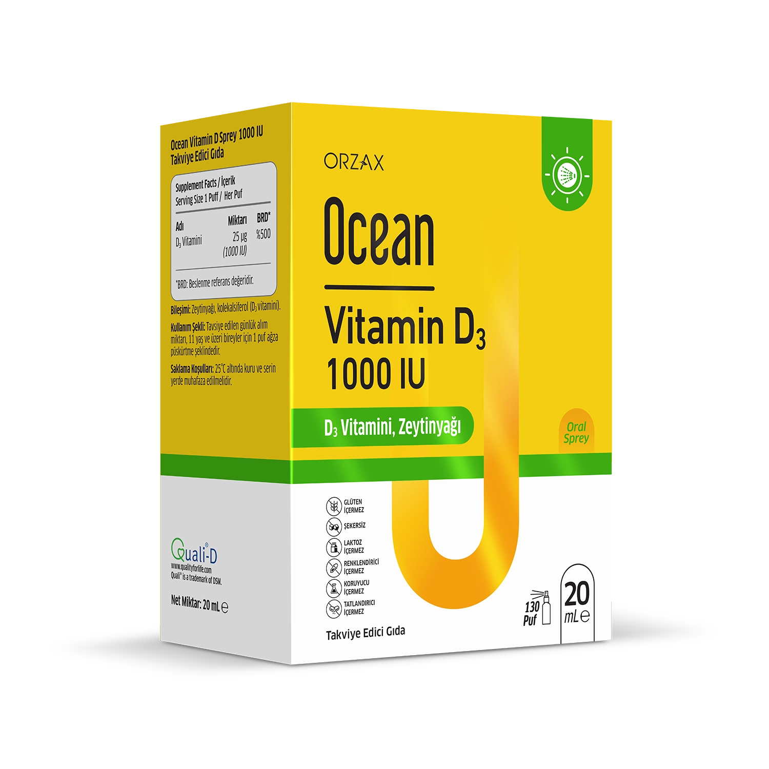 Ocean Vitamin D3 1000 IU, sprey formunda Quali – D patentli 1000 IU D vitamini içeren bir gıda takviyesidir. Taşıyıcı ve koruyucu olarak hakiki zeytinyağı kullanılmaktadır. Koruyucu, katkı maddesi, renklendirici, tatlandırıcı, yapay aroma verici ve ilave şeker içermez.